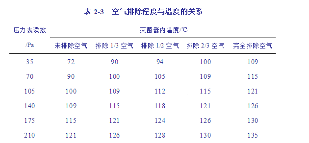 由上表看出:如不將滅菌鍋中的空氣排除干凈,即達(dá)不到滅菌所需的實(shí)際溫度。因此,必須將滅菌器內(nèi)的冷空氣完全排除,才能達(dá)到完全滅菌的目的。