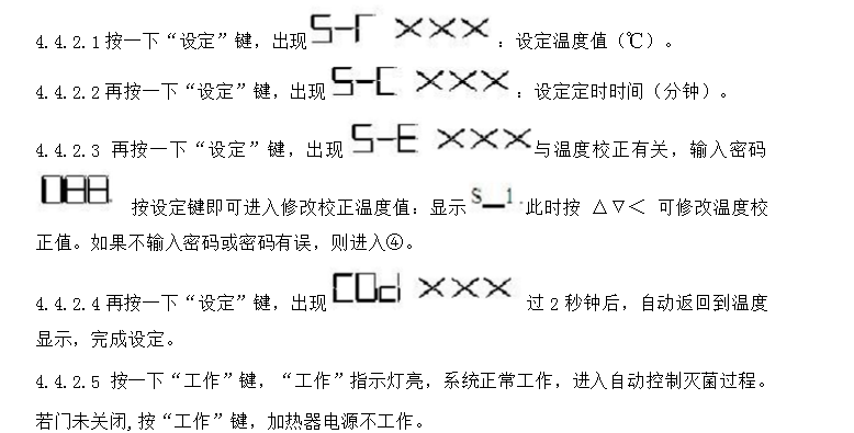 4.4.1開啟電源開關接通電源,數(shù)顯控制儀顯示。此時可開始設定溫度和滅菌時間。 4.4.2設定方法: